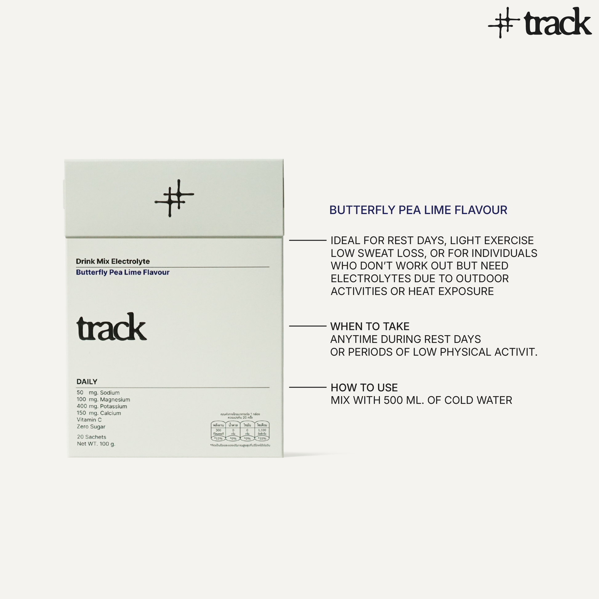 Track Electrolyte Drink Mix – Daily Formula is made to support hydration and replenish essential electrolytes on low-activity days. It contains five key electrolytes—sodium (low), magnesium, potassium, chloride, and calcium—with zero sugar.